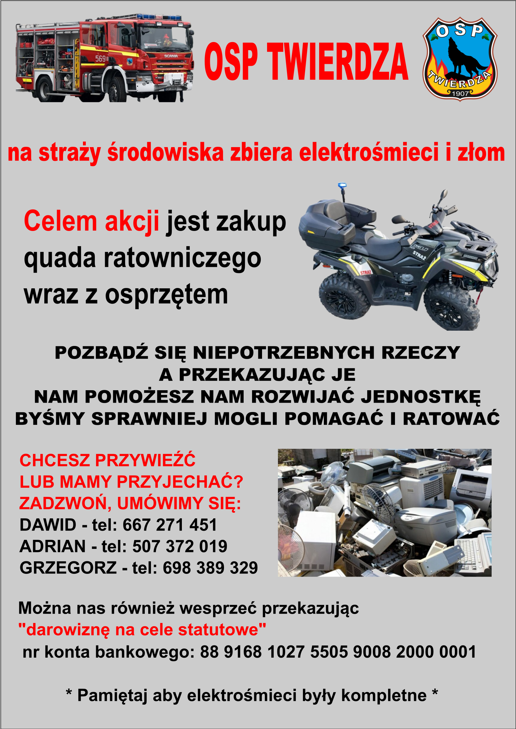 Każdy może wesprzeć nas w tym zadaniu poprzez przekazanie zepsutych urządzeń elektrycznych, zalegającego i niepotrzebnego złomu czy poprzez dokonanie darowizny na konto bankowe.